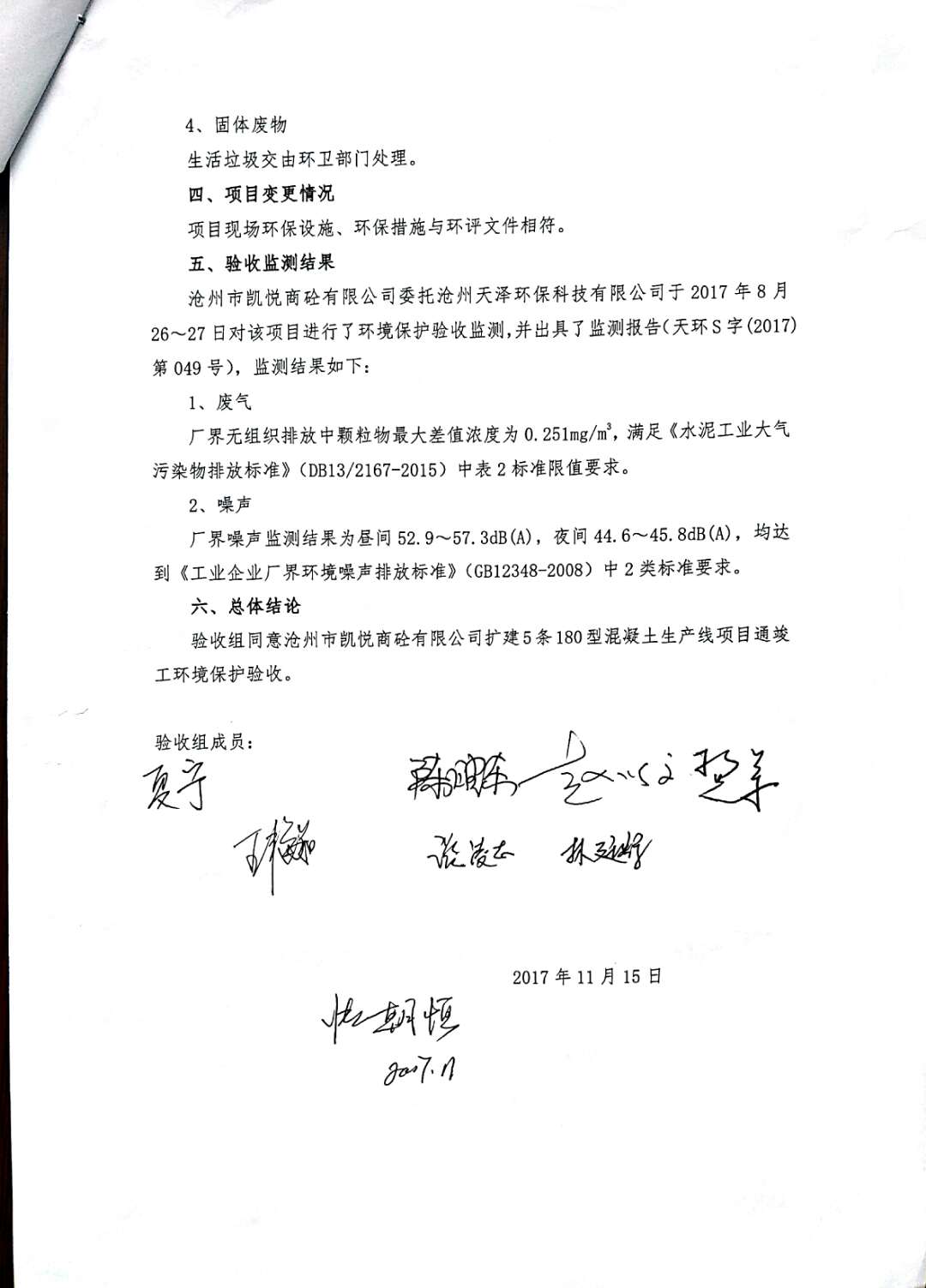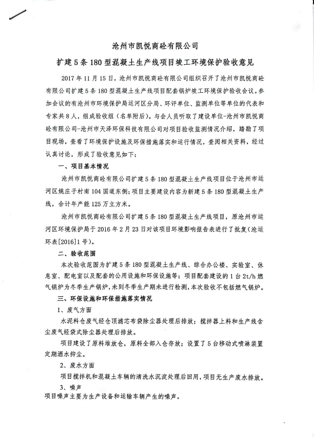 根據(jù)2017年10月1日開始實(shí)施的《建設(shè)項(xiàng)目環(huán)境保護(hù)管理?xiàng)l例》的相關(guān)規(guī)定,2017年11月15日滄州市凱悅商砼有限公司組織召開了《擴(kuò)建5條180型混凝土生產(chǎn)線項(xiàng)目竣工環(huán)境保護(hù)驗(yàn)收》技術(shù)評(píng)估會(huì),滄州市運(yùn)河區(qū)環(huán)境保護(hù)局、環(huán)評(píng)編制單位、環(huán)境監(jiān)測(cè)單位、施工單位及特邀專家組成。驗(yàn)收組對(duì)項(xiàng)目進(jìn)行了實(shí)地查看,檢查了項(xiàng)目環(huán)境建設(shè)和運(yùn)行情況,聽取了各單位對(duì)該項(xiàng)目的竣工驗(yàn)收?qǐng)?bào)告,在充分討論后認(rèn)為本項(xiàng)目在建設(shè)過(guò)程中基本執(zhí)行了國(guó)家建設(shè)項(xiàng)目環(huán)境管理制度以及“環(huán)保設(shè)施與主題工程同時(shí)設(shè)計(jì)、同時(shí)施工、同時(shí)投產(chǎn)使用”的規(guī);建設(shè)單位落實(shí)了環(huán)評(píng)報(bào)告及其批復(fù)要求的環(huán)境影響治理措施,減緩了項(xiàng)目建設(shè)運(yùn)營(yíng)中的主要負(fù)面環(huán)境影響,同意通過(guò)竣工環(huán)境保護(hù)驗(yàn)收。