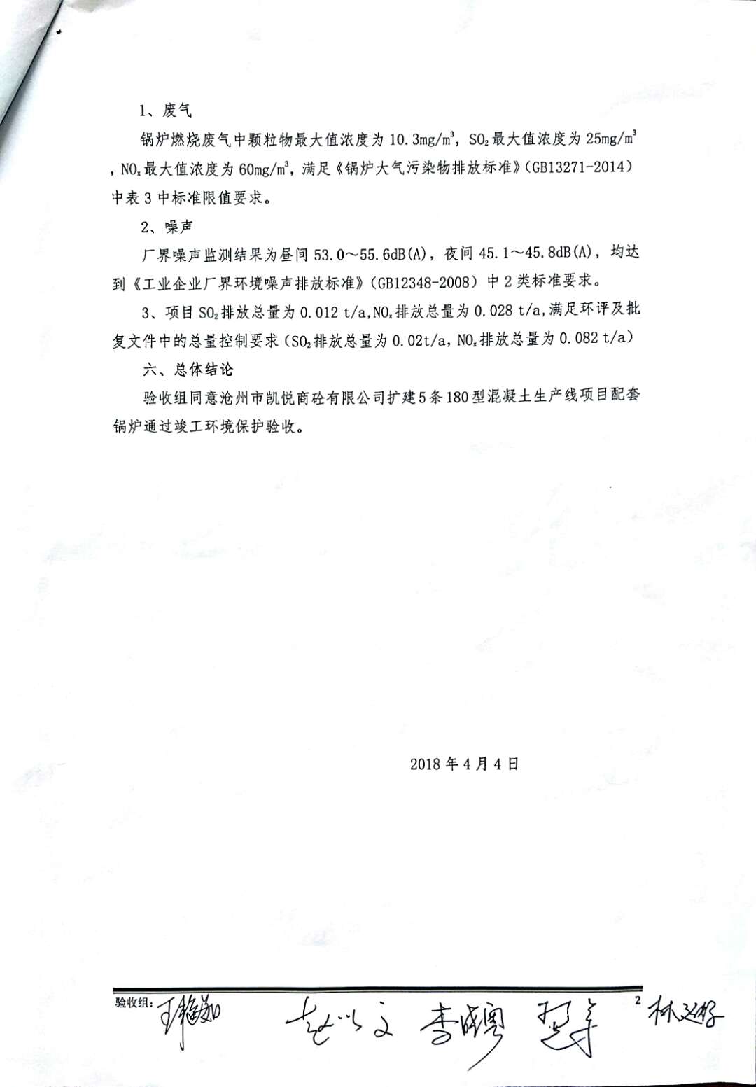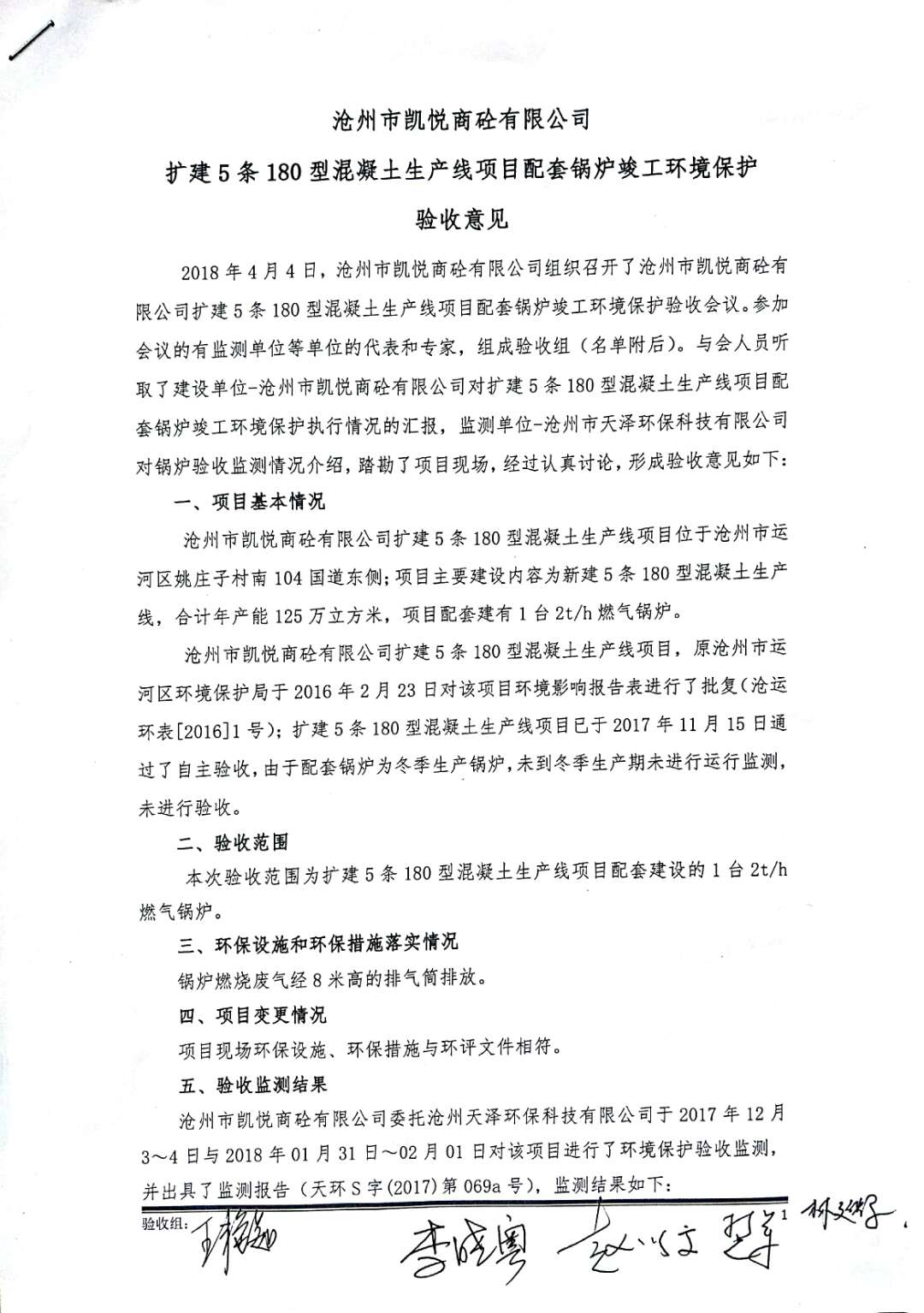 根據(jù)2017年10月1日開始實(shí)施的《建設(shè)項(xiàng)目環(huán)境保護(hù)管理?xiàng)l例》的相關(guān)規(guī)定,2017年11月15日滄州市凱悅商砼有限公司組織召開了《擴(kuò)建5條180型混凝土生產(chǎn)線項(xiàng)目配套鍋爐竣工環(huán)境保護(hù)驗(yàn)收》技術(shù)評估會,滄州市運(yùn)河區(qū)環(huán)境保護(hù)局、環(huán)評編制單位、環(huán)境監(jiān)測單位、施工單位及特邀專家組成。驗(yàn)收組對項(xiàng)目進(jìn)行了實(shí)地查看,檢查了項(xiàng)目環(huán)境建設(shè)和運(yùn)行情況,聽取了各單位對該項(xiàng)目的竣工驗(yàn)收報(bào)告,在充分討論后認(rèn)為本項(xiàng)目在建設(shè)過程中基本執(zhí)行了國家建設(shè)項(xiàng)目環(huán)境管理制度以及“環(huán)保設(shè)施與主題工程同時設(shè)計(jì)、同時施工、同時投產(chǎn)使用”的規(guī);建設(shè)單位落實(shí)了環(huán)評報(bào)告及其批復(fù)要求的環(huán)境影響治理措施,減緩了項(xiàng)目建設(shè)運(yùn)營中的主要負(fù)面環(huán)境影響,同意通過竣工環(huán)境保護(hù)驗(yàn)收。